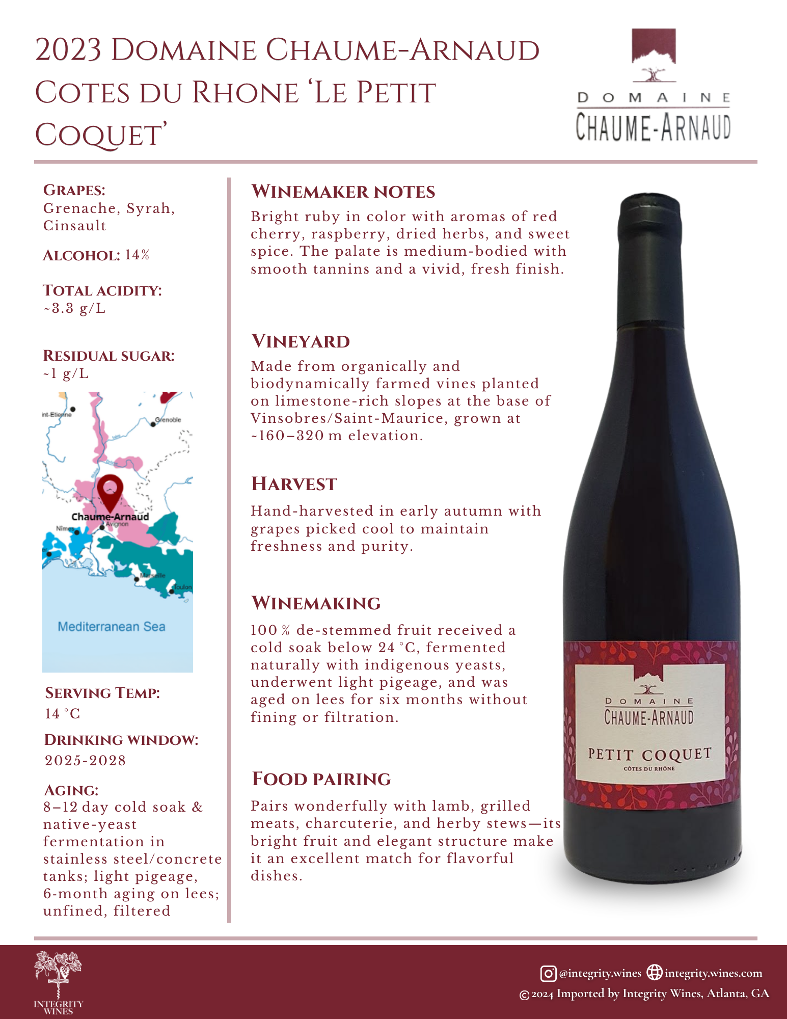 Bright ruby in color with aromas of red cherry, raspberry, dried herbs, and sweet spice. The palate is medium-bodied with smooth tannins and a vivid, fresh finish.